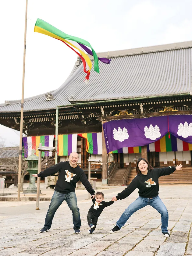 日本で5番目の大きさを誇る国宝の木造建造物・専修寺 御影堂をバックにしたワンショット。息子さんが大好きだというサンバを全力で踊ってくれました。もつれた足がカワイイ一枚。