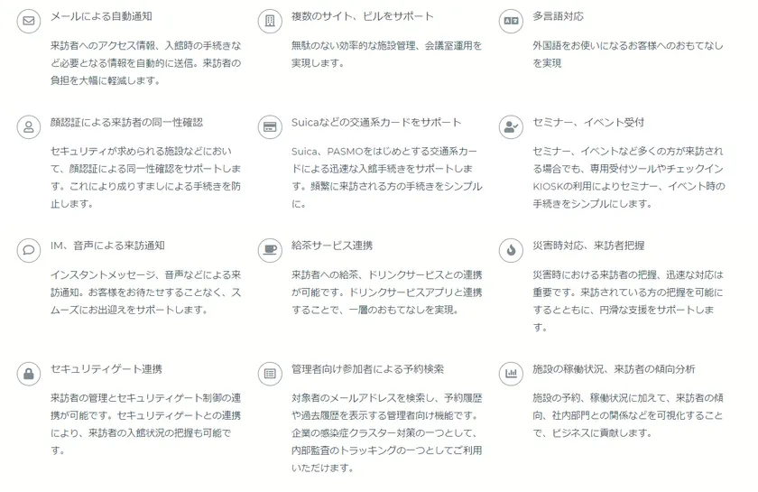 Microsoft 365(Exchange Online、Microsoft Teams)との連携によるOutlook予定表への自動登録や、お客様の入館手続きをスムーズに行うチェックインKIOSK、フラッパーゲートをはじめとする様々なセキュリティシステムとの連動など、入退館の包括的な管理を実現するのが「GuestCool」来訪者管理システムです。