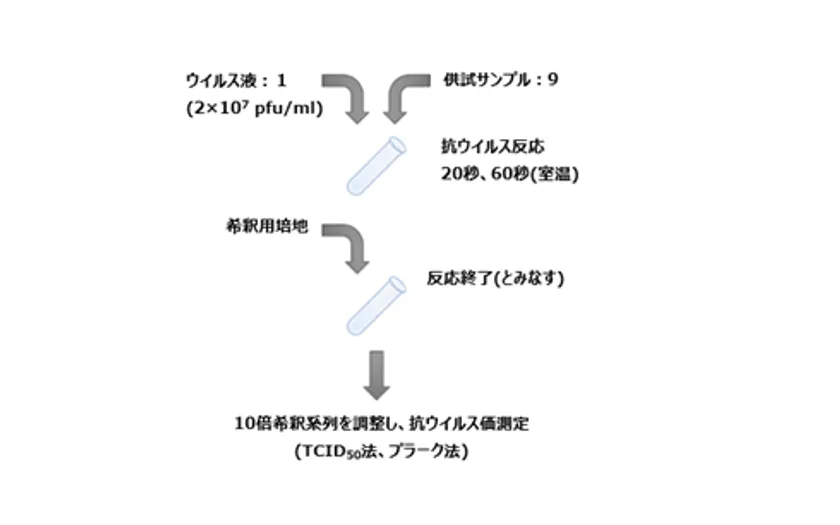 Step(2):ウイルスを含んだ液(2 x 10^7 pfu/ml)と試験対象液((1)、(2)のウェットシートを絞った液体)を各1:9の割合で混合させ、室温で20秒、60秒間、ウイルスを含んだ液と反応させた。希釈用培地にて10倍希釈系列を調整し、TCID50法とプラーク法によりそれぞれ抗ウイルス価を測定した。