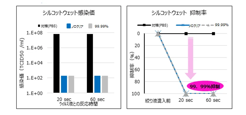 北里大学医療衛生学部において、市場に流通している当社のシルコット ウェットティッシュ『ウイルス除去 ノロクリア(R)ウェット』『99.99%除菌』において、新型コロナウイルス抑制試験を検証し、その効果を実証しました。