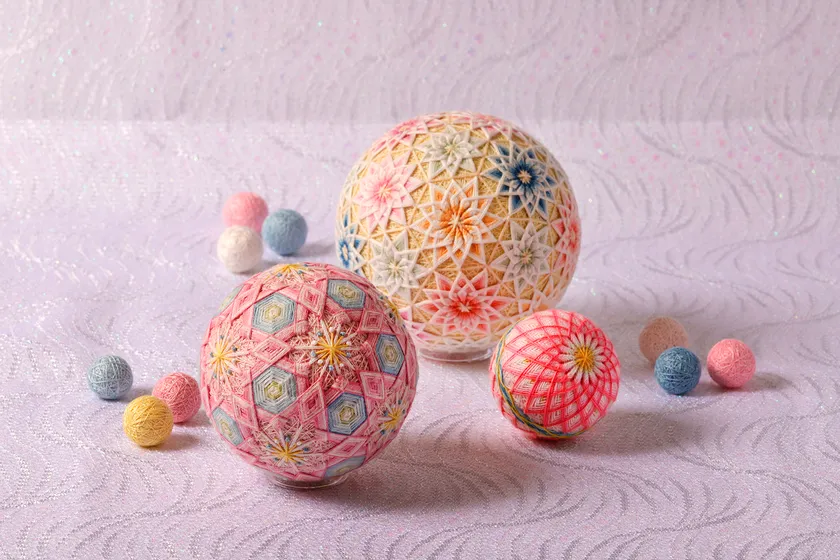江戸時代の庶民に愛された郷土玩具「讃岐かがり手まり」。紙で包んだ籾殻を芯に、草木で染めた木綿の糸を巻いていき、手の感覚だけで球体をつくります。一針一針の手仕事により幾何学的な模様を生み出すのが特徴的です。