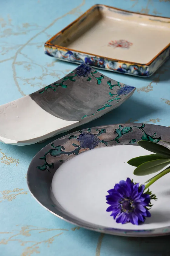 信楽の里に工房を構える中郷窯。作風が異なる兄弟2人が営む窯で、おもにホテルや料亭などのうつわを手がけています。今回ご紹介する、兄・工友さんのうつわは、自由闊達な絵付けが魅力。存在感があるデザインながら、料理を邪魔せず引き立ててくれます。洋食器のようなデザインでも、不思議と和食が映えたり、コーディネートがとてもたのしいうつわです。