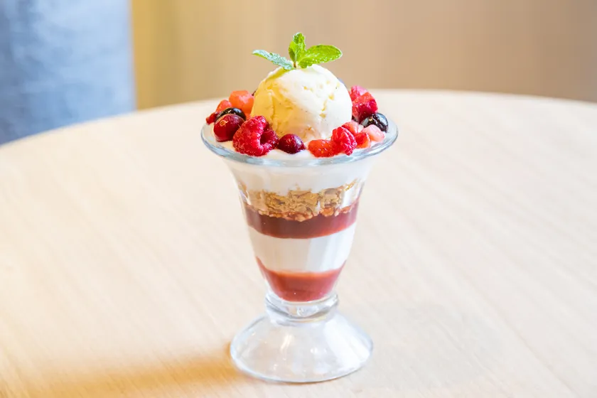さわやかな酸味のベリー類と一緒に食べることで、ヨーグルトが持つほどよい甘さが引き立ち、またヨーグルトと交互に層をなす色鮮やかで糖度の高いベリーソース、さらにカリッと適度な歯ごたえが楽しめるフルーツグラノーラが、ボリューミーなパフェに“味変”をもたらし、最後のひと口まで飽きることなく、美味しさを楽しむことができます。
