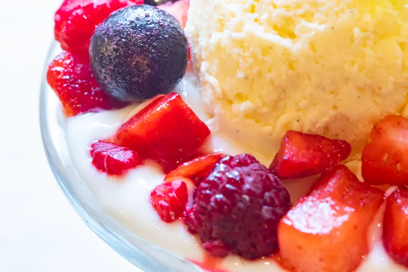 昨今、免疫力を向上する効果の高さで注目を浴びているヨーグルトをベースに、バニラビーンズをたっぷり含んだ香り豊かなバニラアイスと3種のベリー(ラズベリー、ブルーベリー、ストロベリー)をあしらったスイーツです。