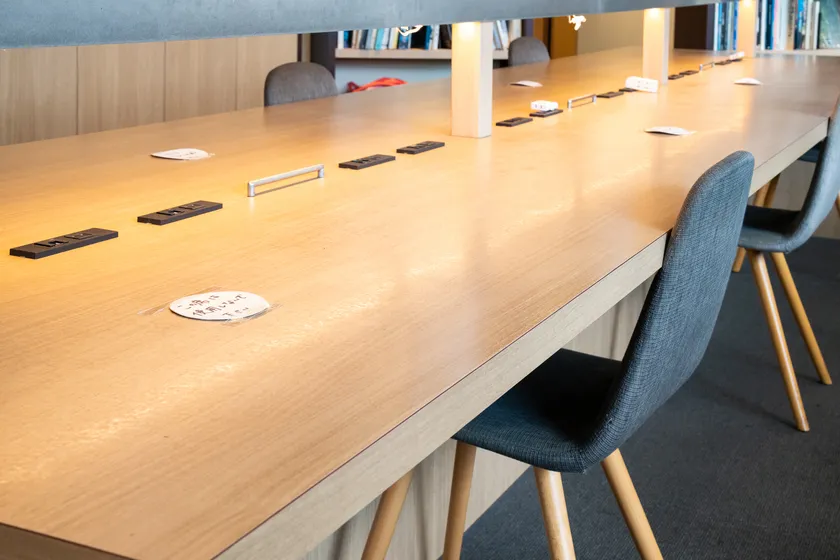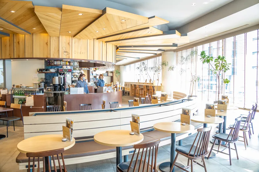 食事はもちろん、落ち着いて仕事をするにもピッタリの明るい店内。無線LANに加え、有線LANコネクタも一部席に設置するほか、全席に電源を整備しています。手指消毒や、お食事中以外のマスク装着ご協力を呼びかけるなど、安心してご利用いただける環境となっています。