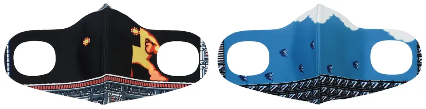 「ロックマン」シリーズのフェイスマスクには、初代「ロックマン」の「ワイリーステージ」、「ロックマン2」の「エアーマンステージ」の背景を、8bit風のドット絵で完全再現してマスク全面にプリント。MSYがこだわりぬいたデザインにより、着用時でもマスク中央の縫製部分がきれいにつながるクオリティを実現しました。別売りの2way刺繍ワッペンを貼り付けることで、マスク上で熱い戦いを再現できます。