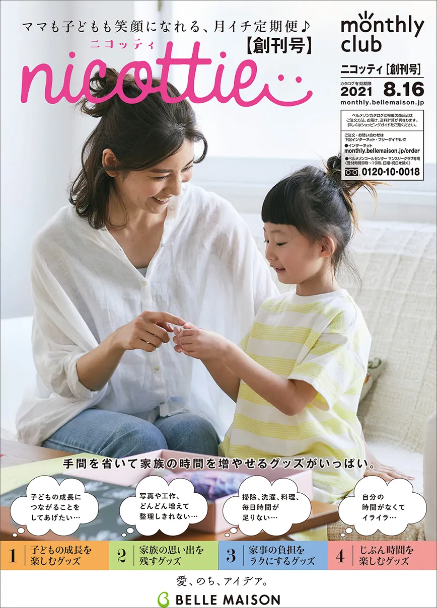 株式会社 千趣会(本社:大阪市 代表取締役社長:梶原健司 以下千趣会)の通販事業ベルメゾンは、3~10歳の子どもを持つ働く女性に向けて、自分時間・家族時間が充実するアイテムと、その時間をつくる家事サポートアイテムをご提案する定期お届け商品「nicottie(ニコッティ)」をマンスリークラブ https://monthly.bellemaison.jp/ にて2021年3月25日(木)より販売開始いたします。