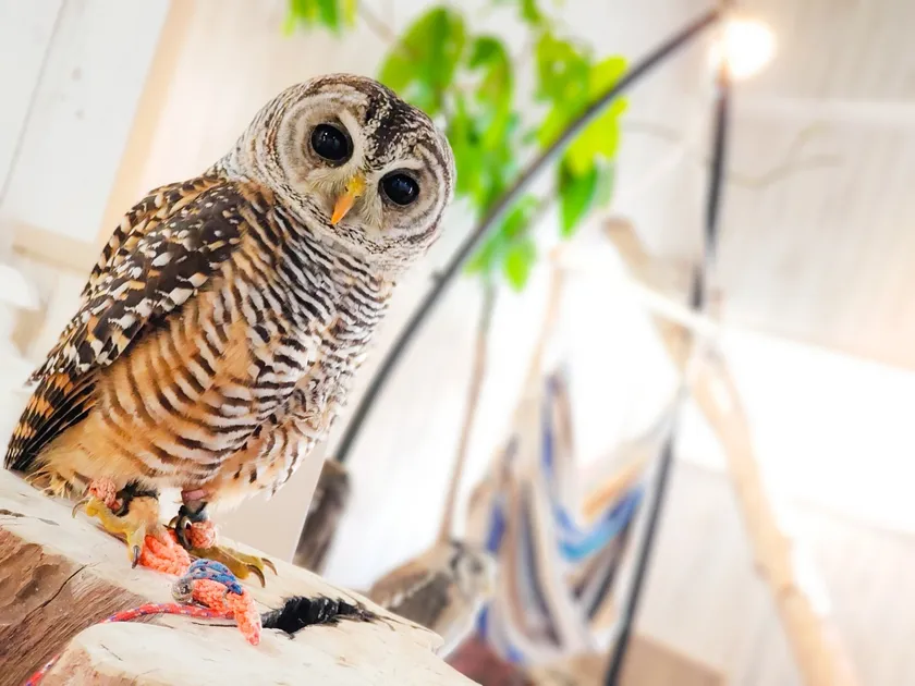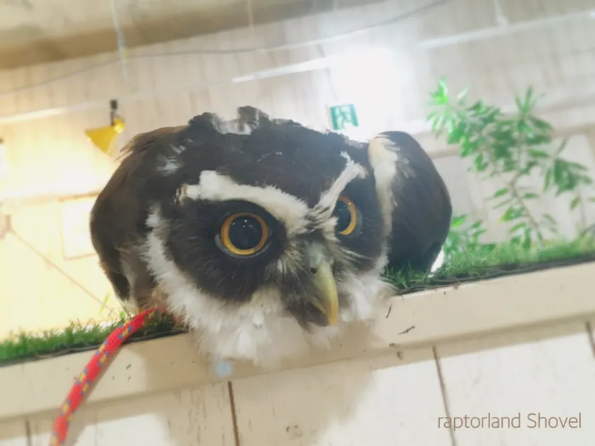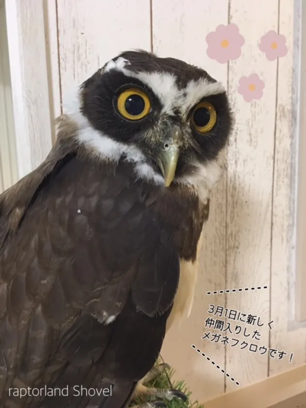 大阪、難波にある猛禽類カフェraptorland Shovel(ラプターランドシャベル)に今年3月、メガネフクロウが新しく仲間入り!