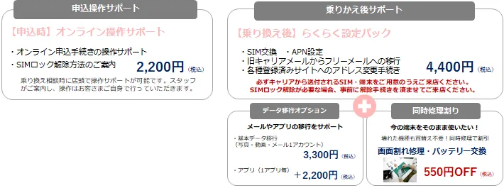 オンライン申込の操作が不安。SIMロック解除って何?設定やメール等の移行が面倒という方は、お得ならくらく乗り換え支援パックをご用意。店頭でサポートします。※有料 ※詳細は下記参照 ※スマホ修理同時申込みの場合:割引あり