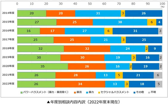 日本スポーツ協会が設置する「スポーツにおける暴力行為等相談窓口」では、過去数年の相談内容をグラフ化にしています。