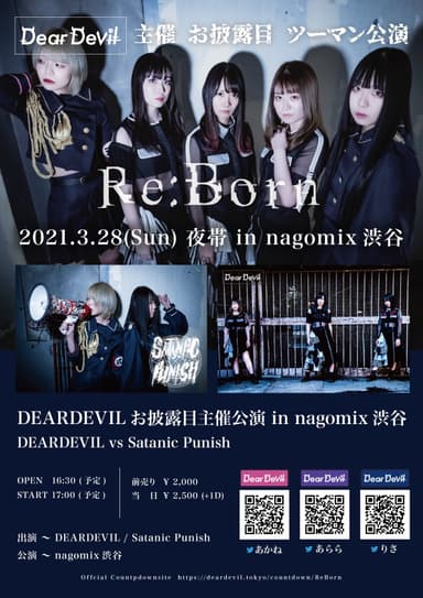 Devil Margin所属新グループ“DEARDEVIL”が、同事務所所属グループで現在デスコア・メタルコアを楽曲コンセプトとして活動している“Satanic Punish”とのツーマン公演にてライブデビューすることが決定いたしました。本ライブイベント「Re:Born」は、nagomix渋谷にて3/28(日)に開催いたします。