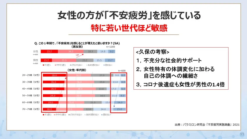 また、男性に比べて女性の「不安疲労」の割合が高く、20代・30代の若い層ほど敏感に「不安疲労」を感じていることが明らかになったことを紹介し、その背景について考察がありました。久保医師は(1)不十分な社会的サポート、(2)女性特有の体調変化に加わる自己の体調への繊細さ、(3)コロナ後遺症も女性が男性の1.4倍であることの3つの視点から女性が不安疲労に陥りやすい要因について解説しました。