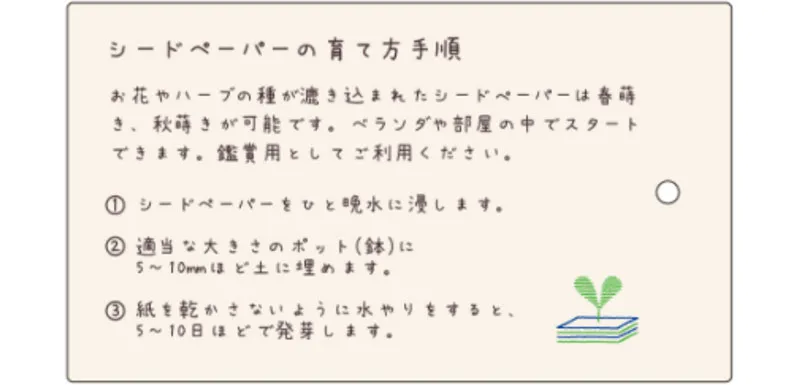 今回、商品をご購入いただいたお客様には、さまざまなお花の種を、環境にやさしいリサイクルペーパーに混ぜ込んだ「シードペーパー(R)」を、1点につき1枚プレゼントいたします。