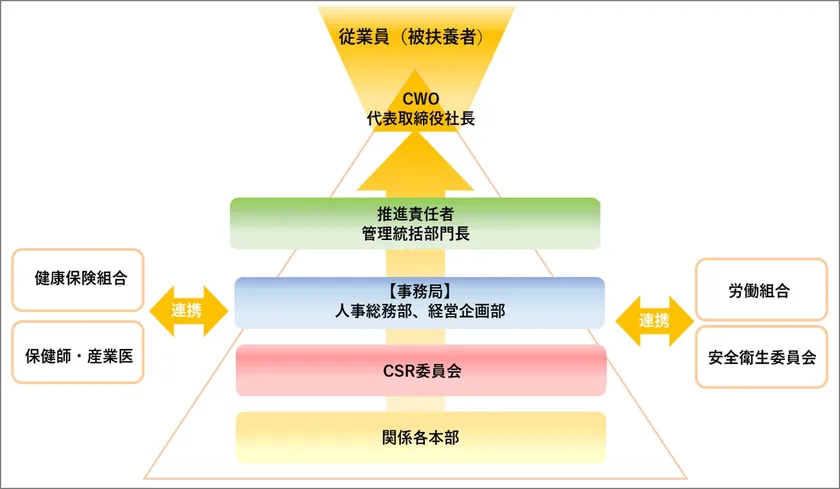 当社は、健康経営を推進するため、最高健康責任者(CWO(Chief Wellness Officer))に代表取締役社長を任命し、以下の体制で取り組んでまいります。