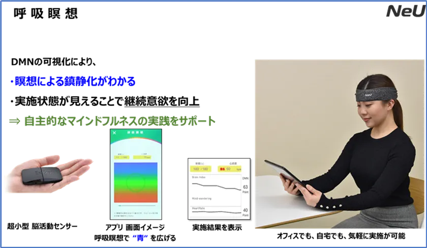 本プログラムは、超小型脳活動センサー(XB-01、以下、脳活動センサー)を使い、脳のデフォルト・モード・ネットワーク(注1)(DMN)の沈静化をリアルタイムでモニタリングし、呼吸瞑想が出来ているかの可視化を行います。近年ストレスリダクションの手段として、マインドフルネスが注目されていますが、呼吸瞑想は、誰でも簡単にマインドフルネスを実践する方法の1つです。