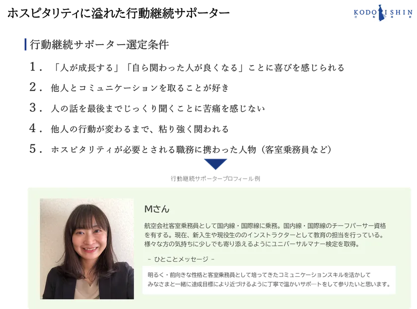 そして今回、更に継続していただくためのプレミアムオプションとして、(株)KODO ISHINとの協業により、現役キャビンアテンダントによる1on1支援プログラムを設けます。キャビンアテンダントの高いホスピタリティに溢れたコミュニケーションスキルを活かし、月1回のオンラインでの面談により、参加者の継続をサポートしてまいります。
