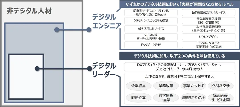本調査では、両者を「デジタル人材」とし、なかでも、前者を「デジタルエンジニア」、後者を「デジタルリーダー」と定義する。(図1)