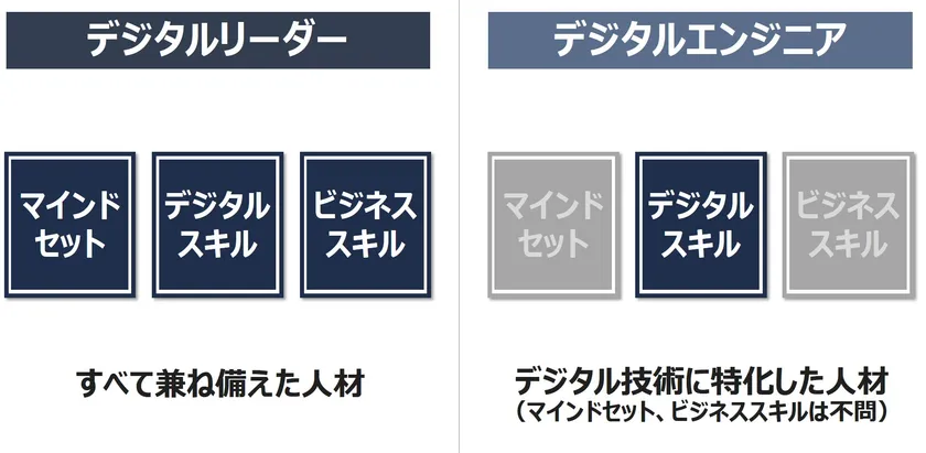「デジタルエンジニア」は高度なデジタルスキルを備えていることが人材要件である一方で「デジタルリーダー」はデジタル技術やデジタルエンジニアを活用するためのデジタルスキルだけでなく、事業やサービスを構想するためのビジネススキル、変革を牽引するための主体性・意欲・好奇心などのマインドセットのいずれも備えていることが要件となる。(注5)(図2)