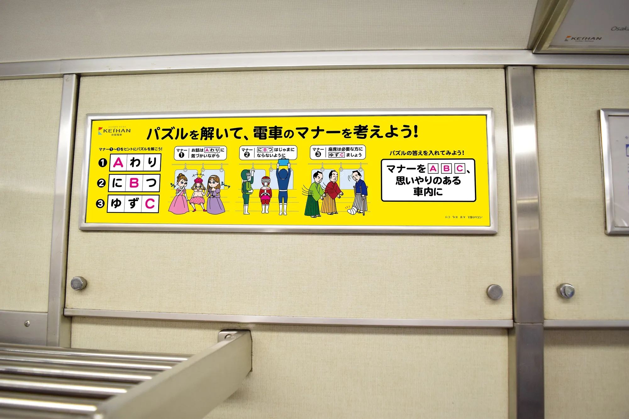 京阪電気鉄道株式会社(本社:大阪市中央区、社長:中野道夫)では、電車内でのマナー向上を呼びかけるマナーポスターの新シリーズ「パズルを解いて、電車のマナーを考えよう!」を2021年4月1日(木)から来年3月31日(木)まで掲出します。