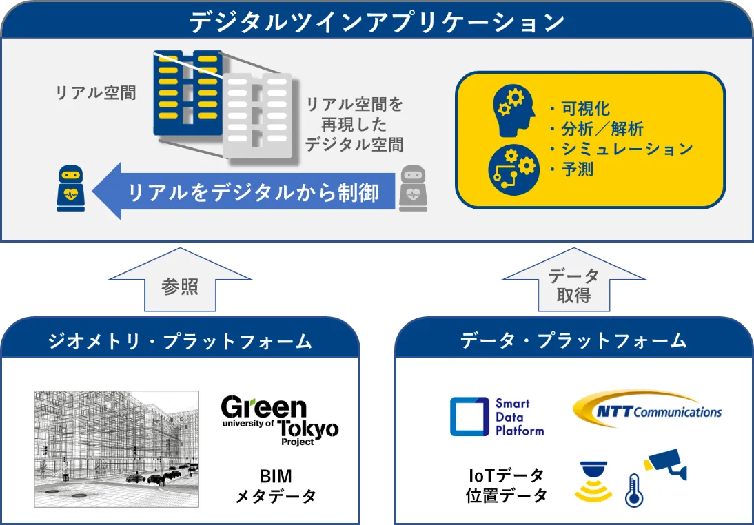 GUTPでは、BIMをはじめとした建築物データの活用手法や、クラウドを用いたデジタルツイン・アプリケーションを構築するための研究開発を行っています。またNTT Comは、データの収集・蓄積・活用までを一元的実現できる「Smart Data Platform」(※3)を提供しており、同サービスを活用したデジタルツインの社会実装を目指しています。