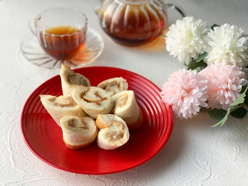 1. 「生」食パンを厚さ1~1.5センチスライスし、めん棒で両面をプレスする。
