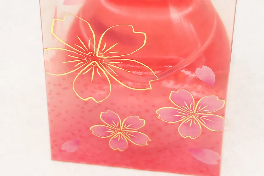 新しいパッケージには3つのポイントを込めています。まずお祝い事のプレゼントとして贈られる事から金箔でさくらの花を大きくかたどり、華やかさを引き出しました。女性が身に着けるアクセサリーのように、正面で一番輝くよう配置しています。そして2つ目に、味わいのベースともなる梅。「梅の実」をイメージしたたくさんの丸を重ねて敷き詰めるようにデザインしていますが、淡く儚い色合いを保ちつつ華麗さを表現するためにネイルデザインを参考にしたと言います。また、たくさんの円(丸)が重ねることで一層「縁」が広がるようにと願いが込められています。最後に、一番大きいポイントはユーザーボイス。以前に「飲み切ってしまうとさくら色が無くなって寂しい」との声を頂き、スタッフはその声が心残りだったと言います。そこでクリアケースにさくら色のレースを引き、グラデーションをかけることによりその色合いを保てるようにデザインしました。発売当初に女子大生の目線で作られたコンセプトを崩さないよう、当社の女性スタッフにもヒアリングを重ね、約6カ月をかけて発売に至りました。