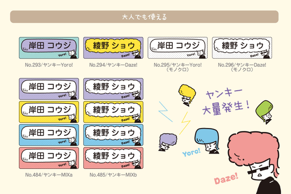 “お名前スタンプ”で販売していたヤンキーが、お名前シールにも登場しました!1デザインタイプ、漫画風のモノクロタイプ、複数カラーが混ざったミックスタイプを展開しています。