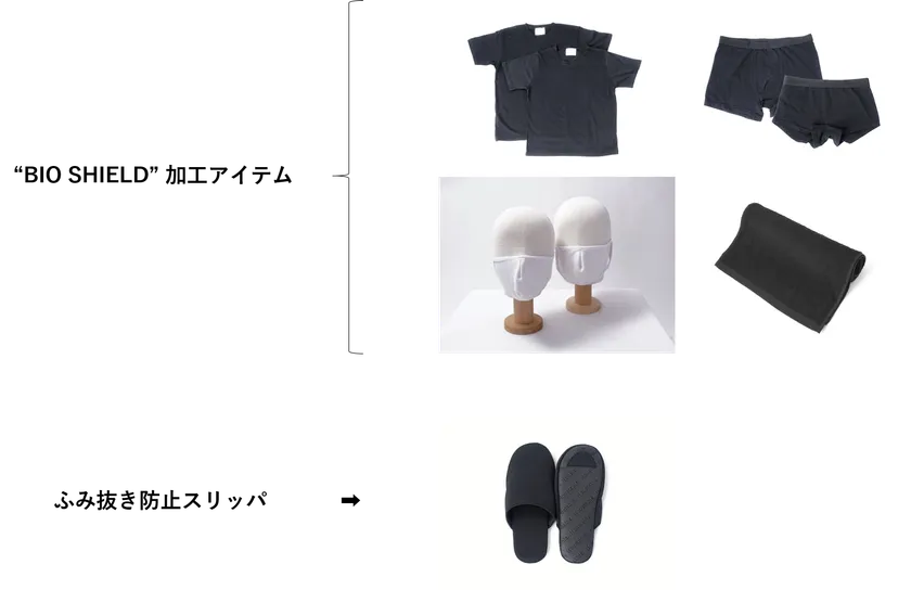 モリリン独自の“BIO SHIELD”制菌加工を施した、日々の生活に欠かせないアイテム「Tシャツ」「ボクサーパンツ」「マスク」「タオル」の4点+ふみ抜き防止材を採用した「スリッパ」を加えた計5点セット。