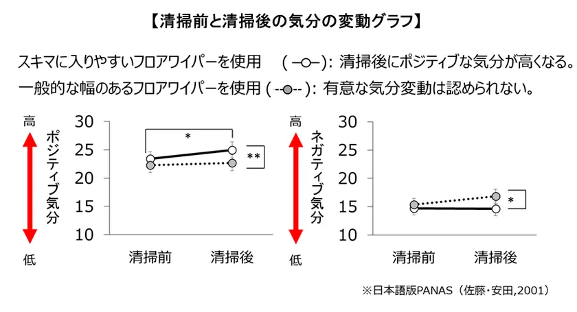 前回の検証では、家具が密集した狭いスキマの多い環境で実験を行い、スキマに入りやすいフロアワイパーで清掃を行うと、清掃後のポジティブ気分が増大することがわかりました。一方で、一般的な幅で厚みのあるフロアワイパーで清掃を行うと、ネガティブ気分が増大してしまうことがわかりました。