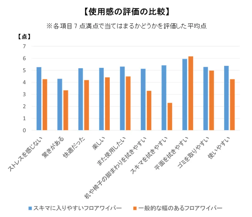 スキマに入りやすいフロアワイパーを使用した場合には、清掃後にポジティブな気分が高くなりました。一方で一般的な幅のあるフロアワイパーを使用した場合には、清掃前後で気分の変化はみられませんでした。使用感の評価では、「平面の拭きやすさ」「ゴミの取りやすさ」を除き、一般的な幅のあるフロアワイパーに比べて、スキマに入りやすいフロアワイパーを使用した場合の方が高く評価されました。具体的には、「ストレスを感じない」「驚きがある」「快適だった」「楽しかった」「また使用したい」「テーブルや椅子の足まわりを拭きやすい」「スキマを拭きやすい」「使いやすい」項目で高く評価されました。