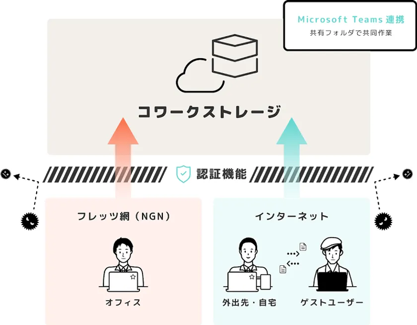NASやファイルサーバと同様の利用環境を実現し、ファイル共有機能による社内外での業務コラボレーションの促進や、NTT東日本の回線認証※1によるセキュアな環境構築など、より柔軟で充実したクラウド活用を支援してまいります。