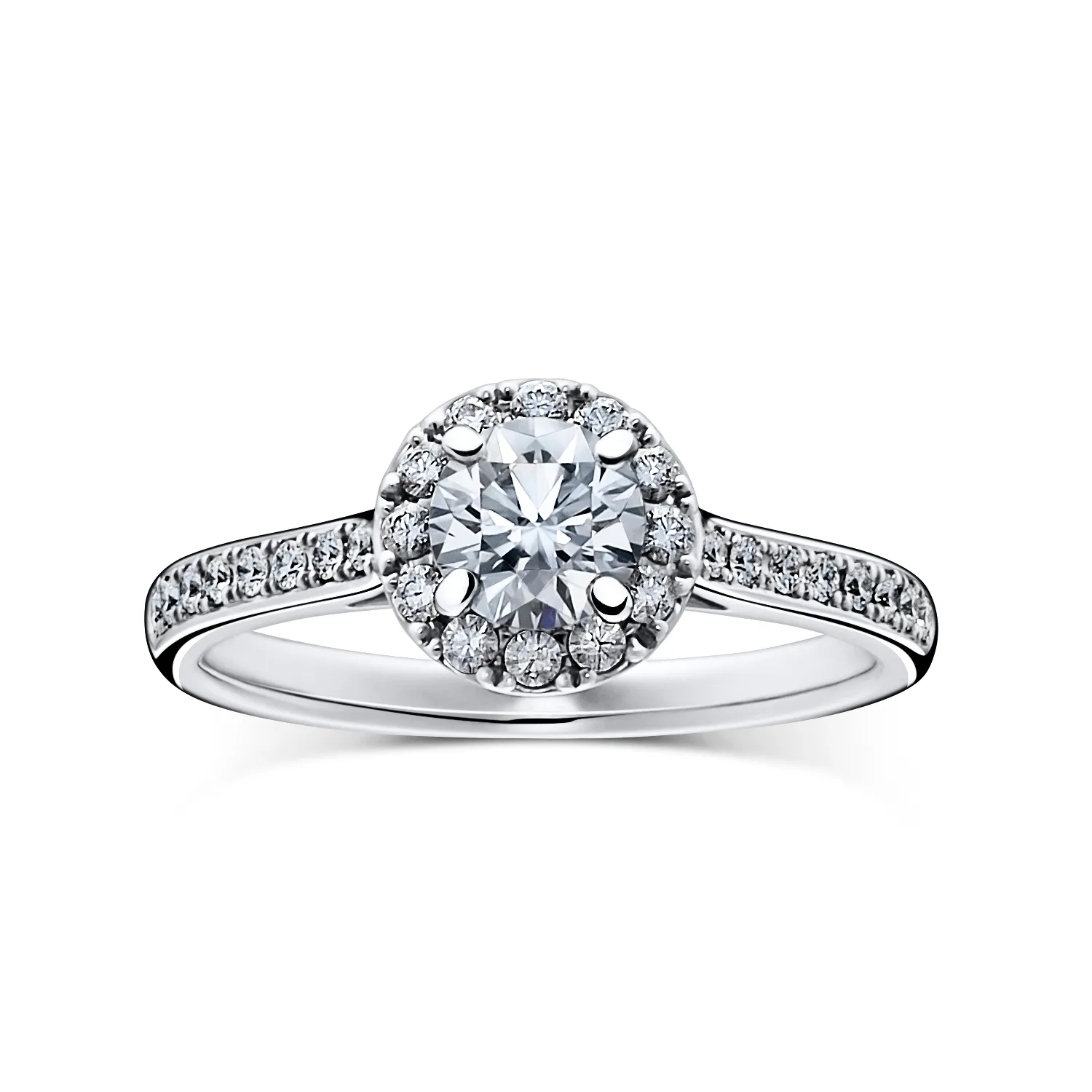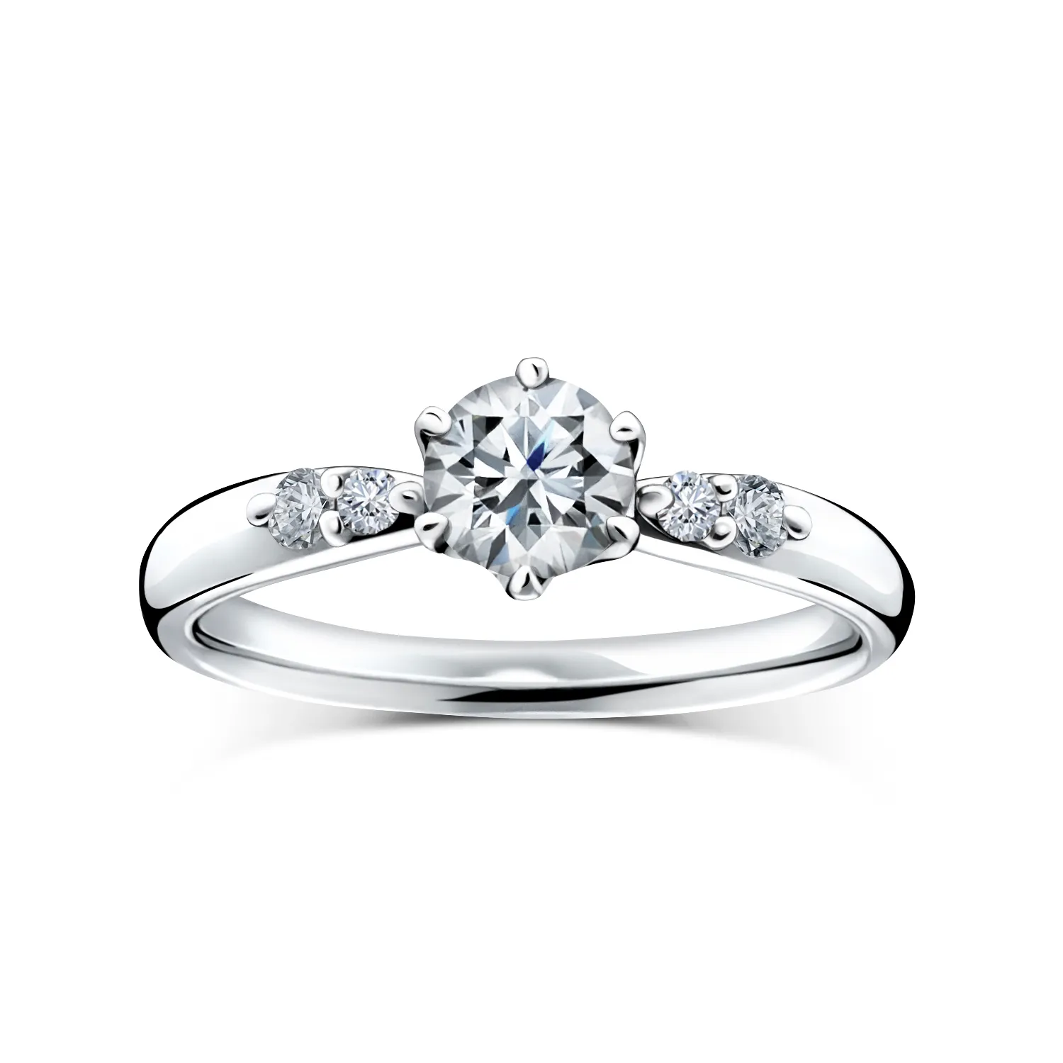 リングのアームに沿って両サイドに配置されたメレダイヤが美しく輝く、シンプルで女性らしいデザインのオーソドックスなリングです。
