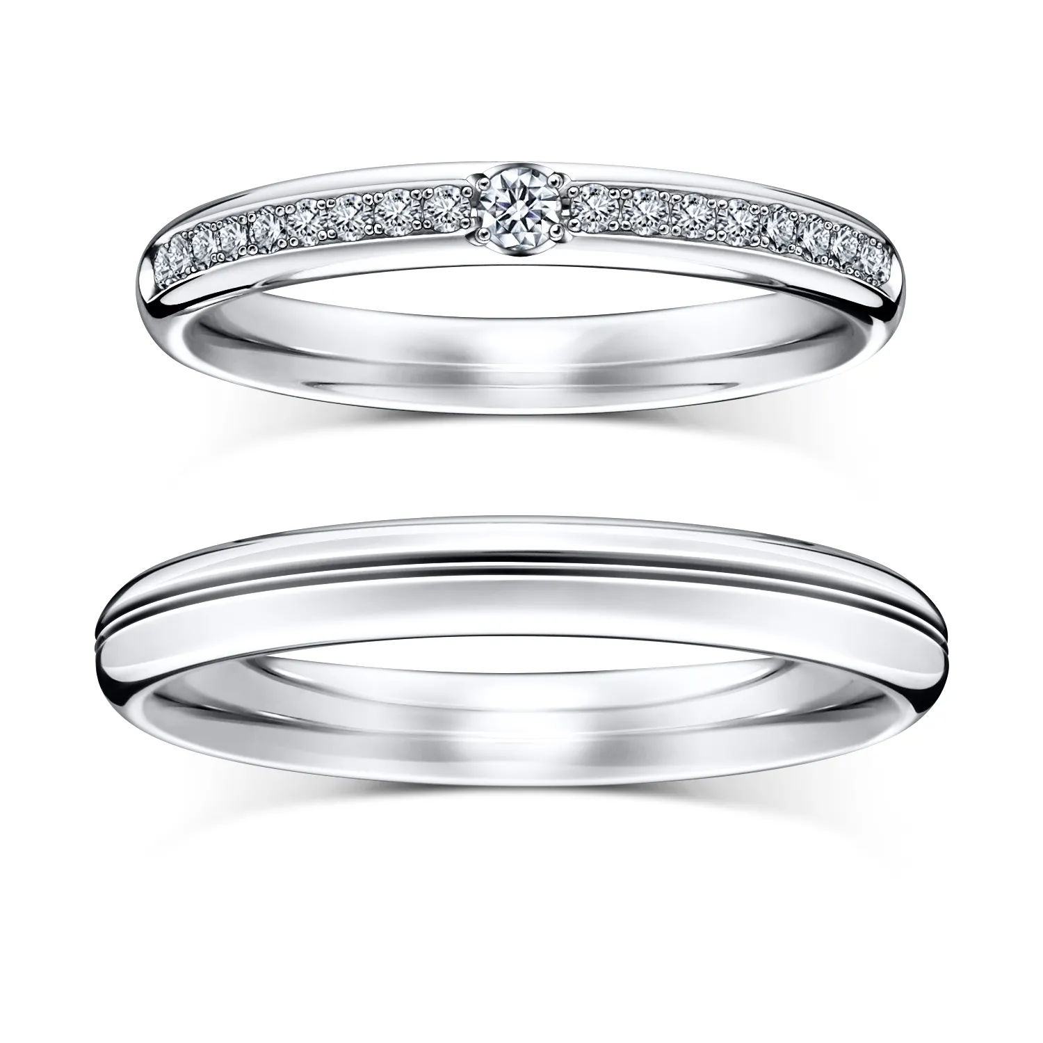 一身にスポットライトを浴びて光り輝くヒロインさながらの、端麗な美を慈しむ。中央のダイヤモンドがまぶしく視線を捉えるリング。シンプルなリングには、ふたりでともに刻んでいく軌跡を2本のラインで表現しています。