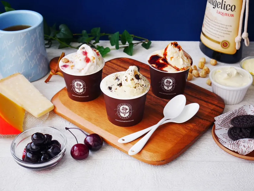 手鍋で砂糖をじっくり焦がしたカラメルを使ったキャラメルジェラートが定番人気のマリオジェラテリア。焦がしカラメルの製造は最も得意とするところです。焦がしを強め、苦みを効かせた真っ黒なカラメルシロップをたっぷりチーズジェラートにトッピングすることで、バスクチーズケーキの見た目、香ばしさを表現しました。チーズはフレッシュタイプのリコッタチーズを使用、ミルクの甘さ、やわらかい風味がベースのジェラートに自然に溶け込んでいます。