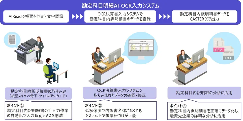 今回、その取り組みで得た知見をもとに本システムを開発し、従前より三井情報が提供している「OCR決算書入力システム(※2)」上で勘定科目内訳明細書の入力も可能にしました。本システムでは当社が提供するAIを活用したOCR「AIRead」にて帳票を判断・文字認識し、データ化した勘定科目内訳明細の情報を「OCR決算書入力システム」で修正や紐づけを行い、「CASTER X(キャスターテン)」(※3)から帳票や勘定科目内訳明細データを出力します。本システムの利用により勘定科目内訳明細書を正確にデータ化することで、金融機関における現預金の粉飾アラートの判断、手形の銘柄や月数から手形の不良化の情報を得るなどの詳細な分析を可能にします。