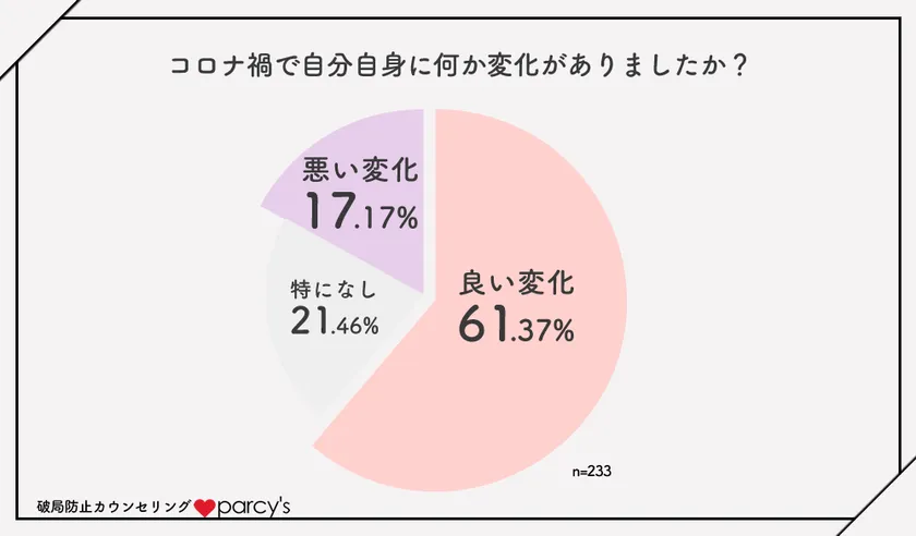 株式会社イグアス(本社:長崎県長崎市、代表取締役CEO:中村 あきら、以下「イグアス」)が運営する女性のためのパートナーシップカウンセリング&トレーニング「parcy's」(読み:「パーシーズ」)は、「好きな人と別れたくない」「ずっとこの人と一緒にいたい」と願う全ての女性に向け、カウンセリングやトレーニングを提供しています。その中でも破局防止カウンセリングはとても人気で、男女ペアの専属パーソナルコンサルタントが3ヶ月間のカウンセリングを実施しています。そんな「parcy's」では2021年2月3日(水)~2月10日(水)の期間において、女性会員233名を対象にコロナ禍のパートナーシップ(夫婦関係・恋人関係)における独自調査を行いました。