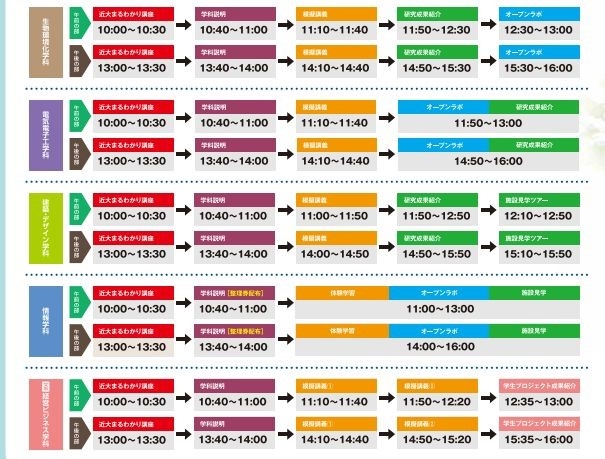 ●文系1学科・理系4学科がそれぞれ学科説明、模擬講義、オープンラボなどを実施