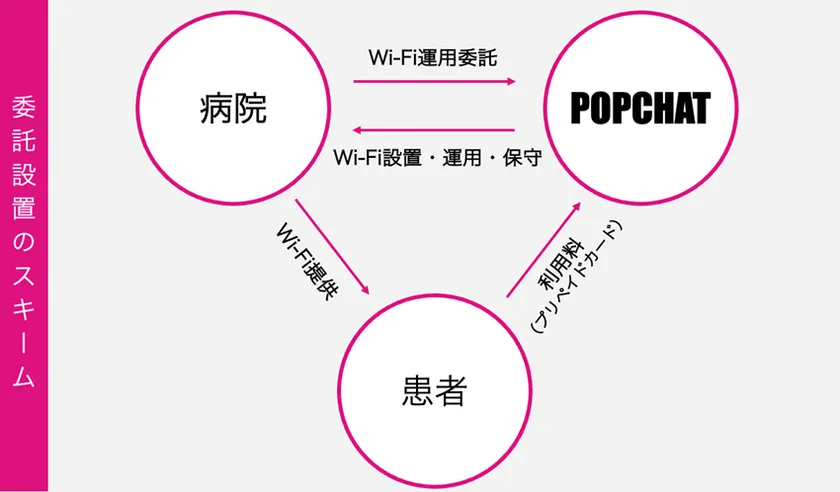 今回の取組みは、医療従事者へコスト・工数を含め一切の負担を掛けずに患者向けのWi-Fiサービス導入をPOPCHATが行います。構図としては、病院がPOPCHAT社へWi-Fi運用を委託し、設置から運用にかかる費用全てをPOPCHATが負担する【委託設置方式】により病院の負担をなくし、入院患者からのWi-Fi利用料で費用負担分を回収する仕組みとなります。
