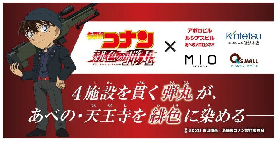 東宝株式会社、株式会社きんえい、株式会社近鉄百貨店、JR 西日本 SC 開発株式会社および東急不動産 SC マネジメント株式会社は、大阪市あべの・天王寺エリアの 『 アポロビル・ルシアスビル・あべのアポロシネマ 』 、 『 あべのハルカス近鉄本店 』 、 『 天王寺ミオ 』 、 『 あべのキューズモール 』 にて、劇場版 『 名探偵コナン 緋色の弾丸 』 4 月 16 日<金>より、あべのアポロシネマほか全国公開)の公開を記念して、 4 施設横断のコラボキャンペーンを開催しますのでお知らせいたします。