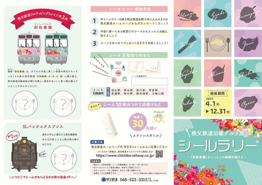 秩父鉄道株式会社(本社:埼玉県熊谷市、代表取締役社長:大谷 隆男)では、2019年11月に誕生したフルラッピングトレイン「彩色兼備」を活用したお出かけ企画として、2021年4月1日(木)~12月31日(金)まで「秩父鉄道沿線グルメ旅 シールラリー~「彩色兼備」といっしょに地域を知ろう~」を開催しています。秩父鉄道沿線地域のグルメをイラスト化したかわいらしいシールを集めながら、地域のことを知ることができます。駅以外でも、イベントに合わせて配布するイベント限定シールが複数登場予定です。埼玉県北西部・秩父地域へのおでかけ、当社イベント参加に合わせて、みなさまにご参加いただきますようお待ちしております。詳細は下記のとおりです。