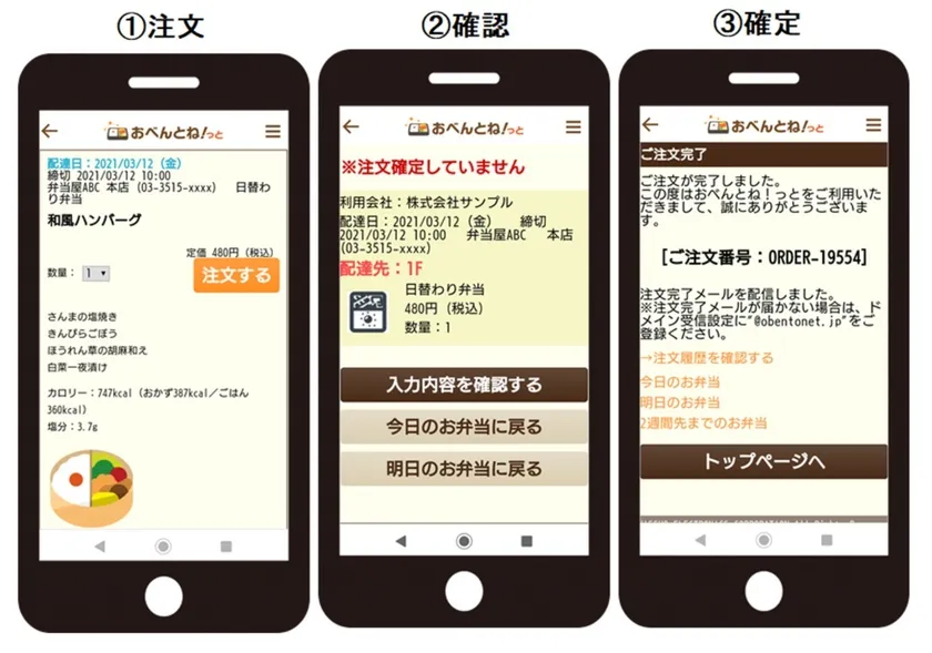 「おべんとね!っと」は、企業の従業員と提携のお弁当会社をつなぐ、お弁当注文サービスです。