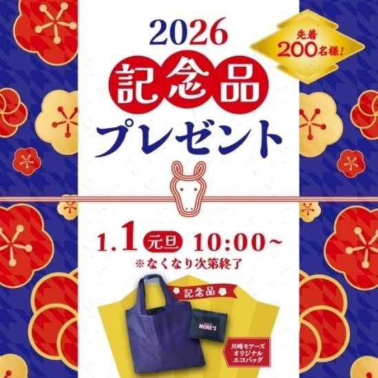 館内でのお買い上げレシートご提示で、記念品「川崎モアーズオリジナルエコバッグ」をプレゼント。1月1日(元日)限定、