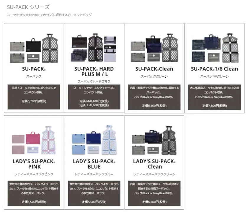 「SU-PACK」シリーズは、平成25年4月、男性用の4分の1収納の「SU-PACK」の販売を開始以来、平成25年11月には、ガーメントケースでは数少ないレディース用「LADY'S SU-PACK」、平成26年11月には、スーツ、ワイシャツ、ネクタイも収納できる「SU-PACK HRAD PLUS」の販売を開始いたしました。