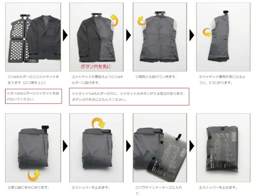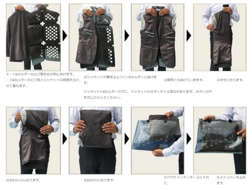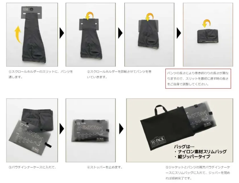 「SU-PACK」は、特許ホルダーにジャケットを被せて順番に折りたたむ独自の収納方法で、ホルダーが生地を固定することでシワにもなり難く、コンパクトに収納できます。スーツがガーメントケースやキャリーケースに収まる便利さは、旅行や出張、冠婚葬祭時のスーツの持ち運びに大変重宝され、購入に結びついており、コンパクトガーメントケースなら「SU-PACK」と言っていただけるようにもなりました。