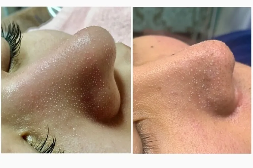 3. 毛穴から皮脂が白く浮き出てくるので、吸引機でキレイに皮脂を吸引します。