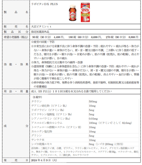 「リポビタンDX PLUS」は、生活者の疲労に寄り添ってきたリポビタンシリーズのベースであるタウリン、ビタミンB1・B2・B6に加え、ビタミンB12、ビタミンC、ビタミンE、カルニチン、グリシン、2種の生薬を配合した錠剤のリポビタンです。
