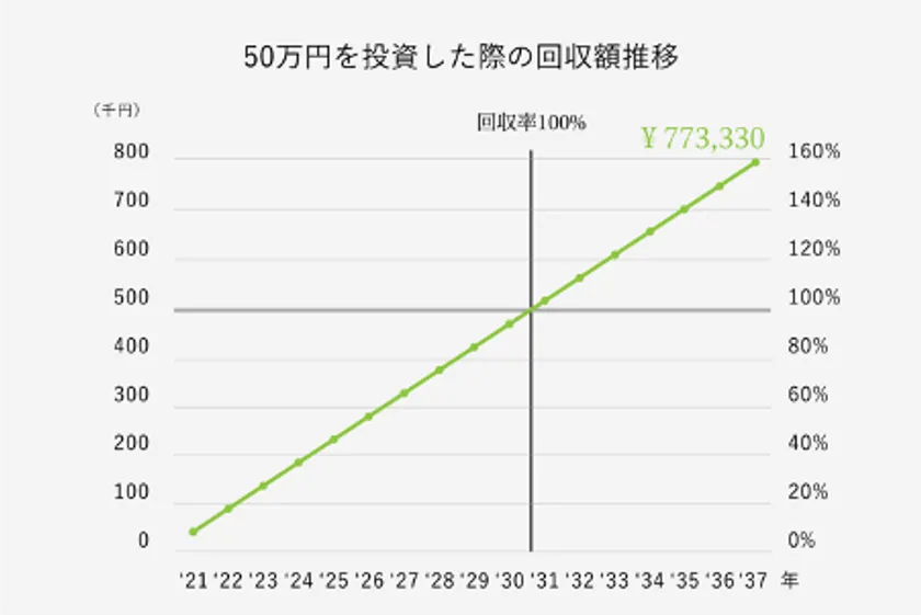 計算期日は運用開始日から1年スパンで毎年設定されており、当ファンドでは4月30日から7月31日の間が当該期間です。想定上では、11年目に投資金の回収率が100%を超える予定となり、50万円を投資した場合、17年目に投資回収率は160%となり、773,330円を回収する予定です。