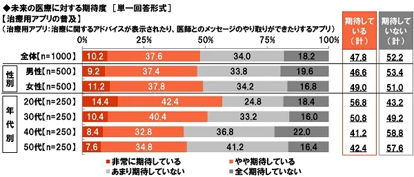 そして、全回答者(1,000名)に、治療に関するアドバイスが表示されたり、医師とのメッセージのやり取りができたりするアプリである【治療用アプリ】の普及について、どのくらい期待しているか聞いたところ、『期待している(計)』は47.8%、『期待していない(計)』は52.2%となりました。