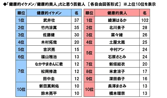 また、健康的美人だと思う芸能人を聞いたところ、「綾瀬はるかさん」(102名)がダントツ、2位「北川景子さん」(28名)、3位「菜々緒さん」(26名)、4位「土屋太鳳さん」(25名)、5位「中村アンさん」と「石原さとみさん」(それぞれ24名)となりました。ドラマ『奥様は、取り扱い注意』でアクションシーンや格闘シーンに注目が集まった綾瀬はるかさんが1位でした。