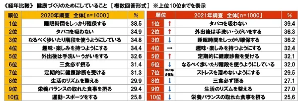 昨年の調査結果と比較すると、順位が上がったのは「タバコを吸わない」(2020年2位→2021年1位)、「外出後は手洗い・うがいをする」(2020年5位→2021年2位)、「定期的に健康診断を受ける」(2020年7位→2021年5位)でした。一方、順位が下がったのは、「睡眠時間をしっかり確保する」(2020年1位→2021年3位)、「三食必ず摂る」(2020年6位→2021年8位)、「生活のリズムを整える」(2020年8位→2021年9位)、「栄養バランスの取れた食事を摂る」(2020年9位→2021年10位)といった睡眠、生活リズム、食事関連の取り組みでした。また、「なるべく歩いたり階段を使うようにしている」(2020年3位→2021年6位)、「運動・スポーツをする」(2020年10位→2021年TOP10圏外)といった身体活動に関する取り組みも順位が下がりました。外出自粛やテレワーク実施によって運動量が減ってしまい、コロナ太りになっている人が増えているのではないでしょうか。